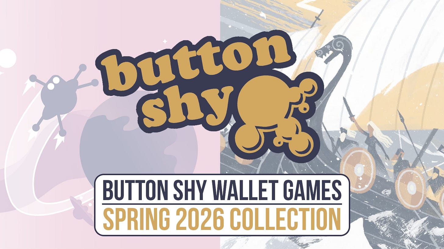 Button Shy Wallet Games: Spring 2026 Collection: Button Shy’s campaigns always feature a PNP level, and they are switching to a multi-game bundle campaign for their next 4 wallet games. This one features the latest in the ROVE series - Astro ROVE, Jarl from Joe Klipfel, Everything Machine, and Shaper. Launching on April 7th. Link.