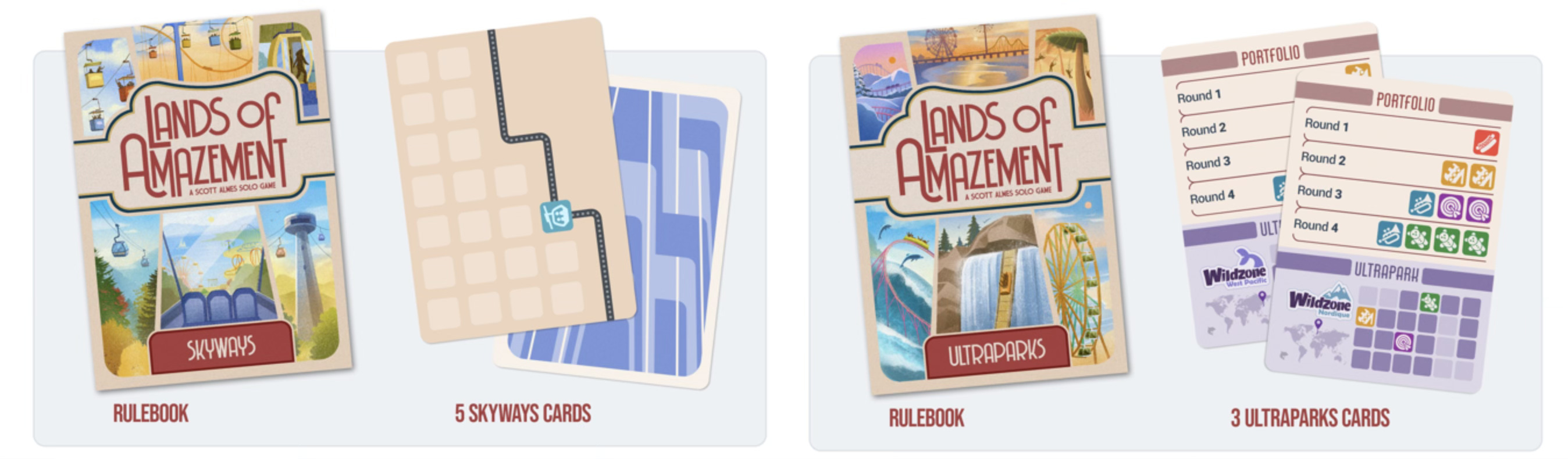 Lands of Amazement: Skyways and Ultraparks: The two latest expansions to Scott Almes and Button Shy’s recent Simply Solo game are now available at The Game Crafter / PNP Hero, and will be at itch.io shortly. Link, Link
