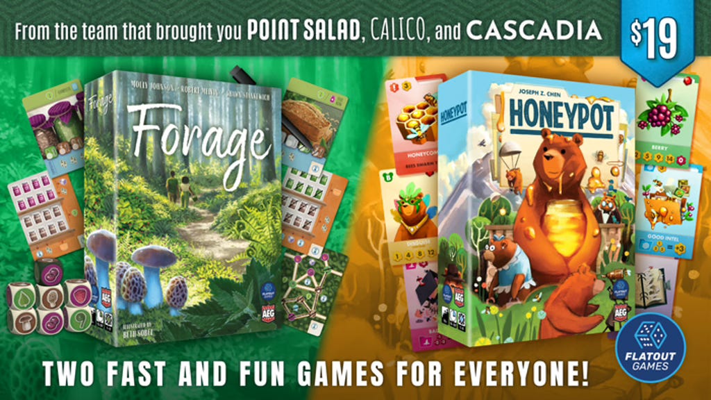 Forage + Honeypot: A pair of fast and fun games for everyone with a $10 two-game PNP pledge level, from the team that brought you the smash hits Point Salad, Calico, and Cascadia! Link.